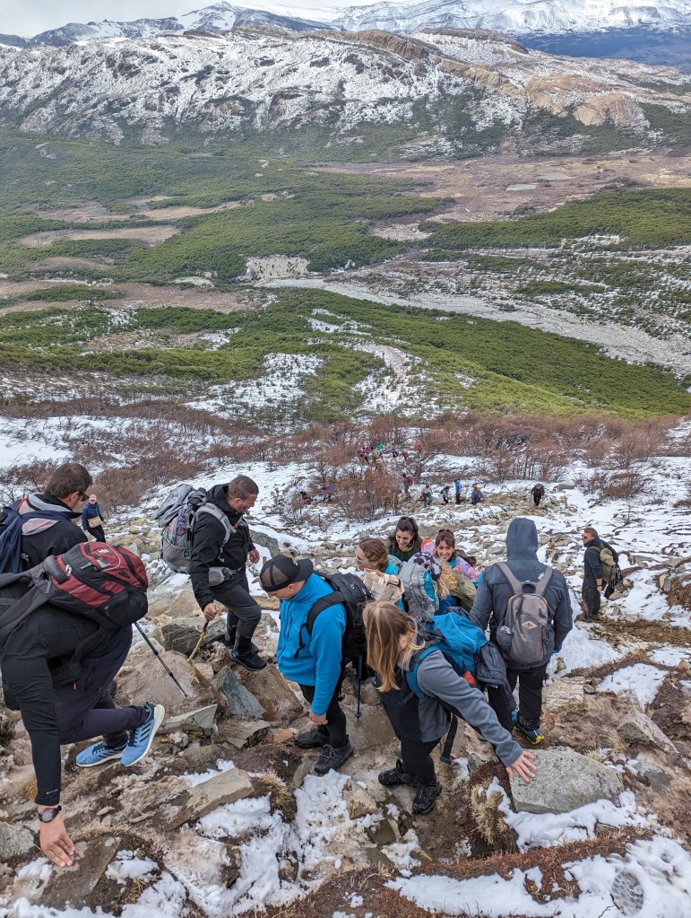 After snapping photos and devouring a few empanadas, we began our descent. Enter: chaos. The hordes had arrived—tour groups from Chile, El Calafate, and beyond. These lot start their hike later, thanks to a 6 AM bus from El Calafate, so by the time we hit the steepest, narrowest part, there was an actual queue to climb up. No room to go down either, so we were forced off the trail, scrambling through bushes, rocks, and snow. Not ideal, but safer than squeezing through the mob.