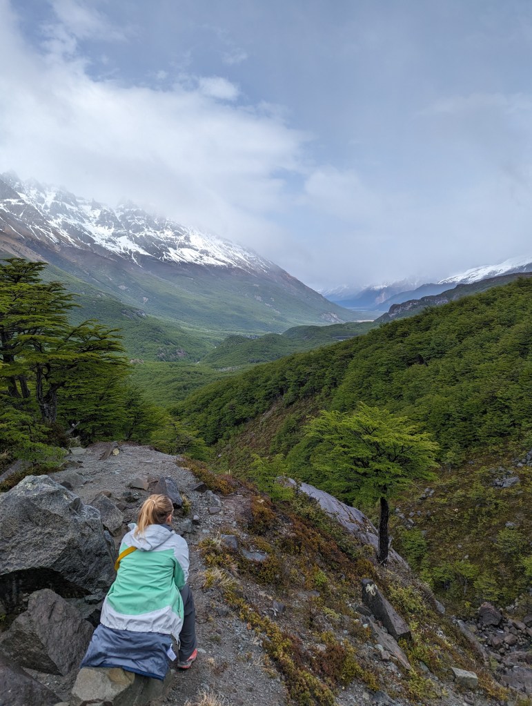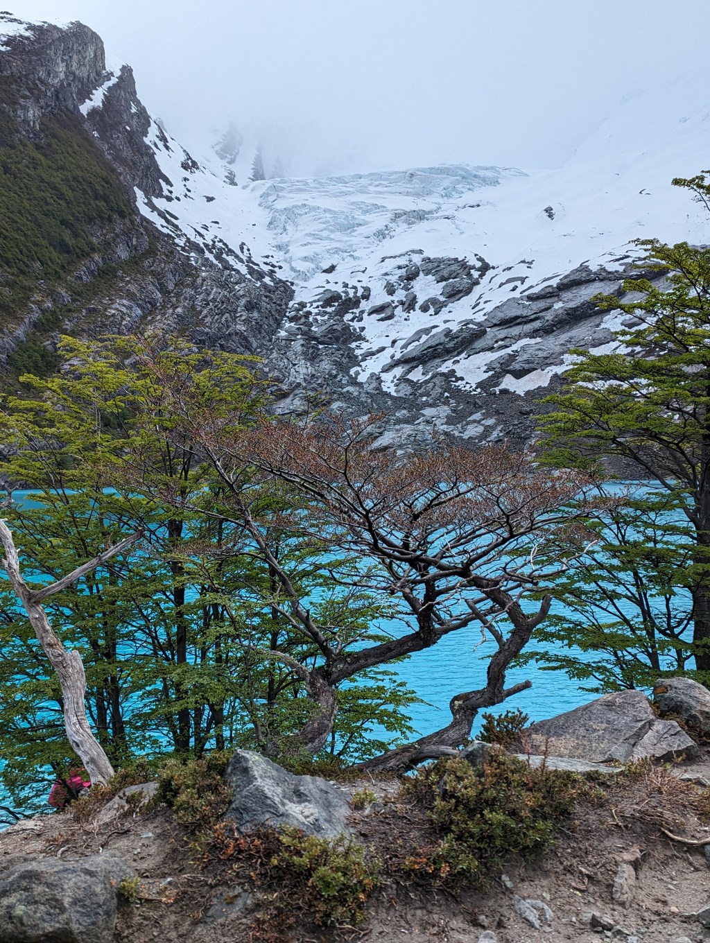 The trail led us to a small river and then climbed up a hill. And oh my god, the view from the top. We’d enjoyed the Fitz Roy vistas earlier in the trip, but this was something else. A lush green valley, then a layer of bare yellowish rock, and finally, snow-covered peaks—the same ones we had just driven through. Easily one of the most spectacular views I’ve ever seen. We stopped for a snack (empanadas, obviously), then carried on for another 15 minutes—10 of which were spent taking photos. In front of us, a glacier tongue was spilling into a bright blue lake, surrounded by green shrubs and grey rocks. With every step, it loomed larger. I was so glad we weren’t in a rush and could just sit and soak it all in.