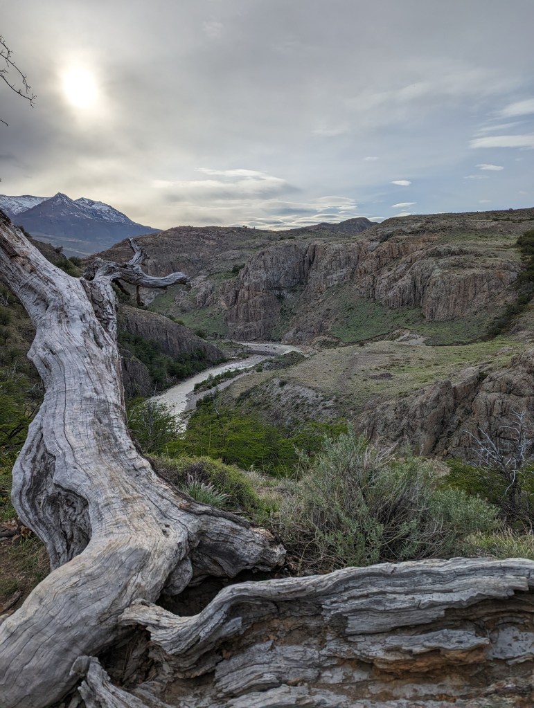 This trail isn’t as popular. For the first hour, we were completely alone, to the point where we started talking louder—you know, to scare off any lurking pumas. 😂 The hike was roughly the same length as the one to Fitz Roy but definitely less challenging. Most of it followed a plateau along the river, which started as a stunning canyon but gradually opened up into a wide, meandering boulder field, flanked by mid-height shrubs. It was clear that a large part of the area had burned down not long ago—fire warning signs were everywhere.