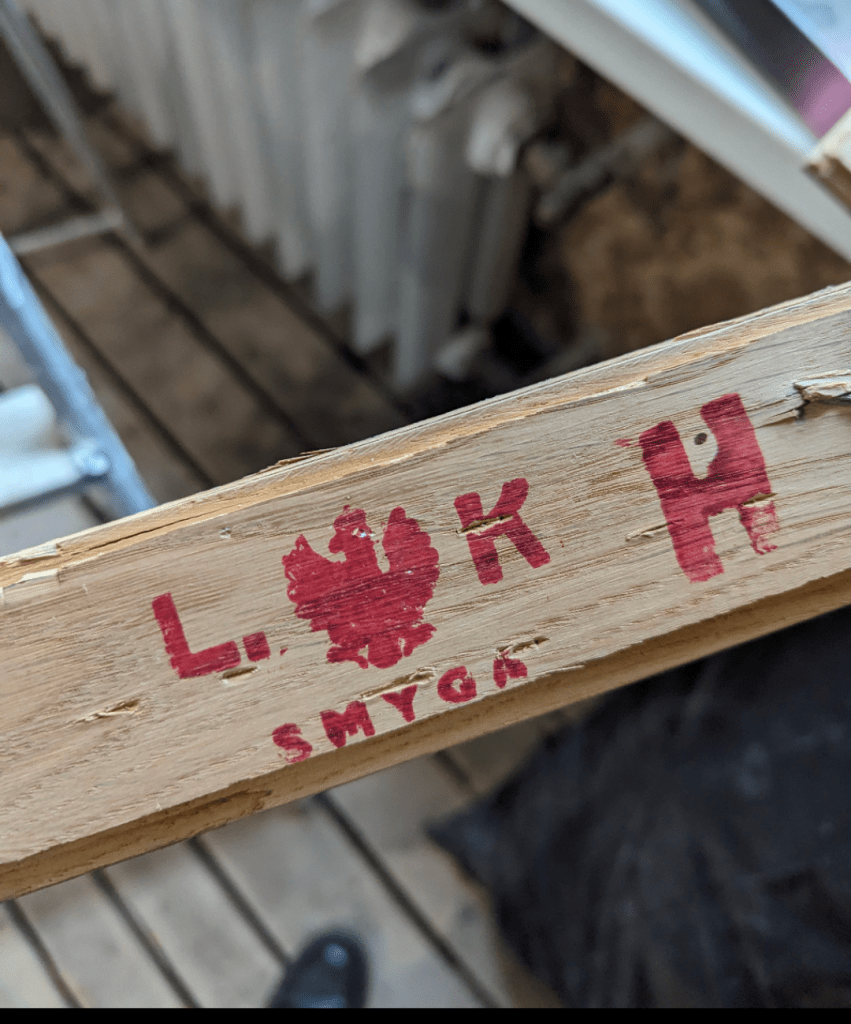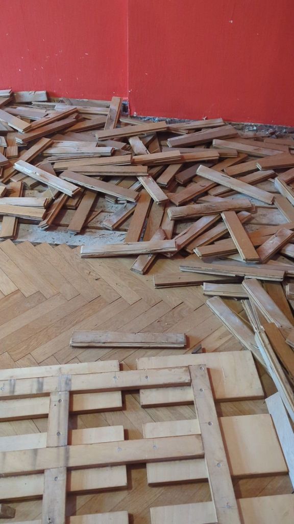 First task: remove the parquet to reuse it later. Which meant: noise. So much noise. If you don’t know, there are two ways to lay parquet – glue or nails. Ours was nailed. That’s good (means it’s old and glue-free) but also horrible (near-impossible to remove without smashing half of it). You can’t exactly buy more of this stuff. It was made in Smyga – a place that was in Poland in 1936 and is now in Ukraine. Some pieces had a red stamp with the Polish eagle on the back. Not something you can pop down to the DIY store for.