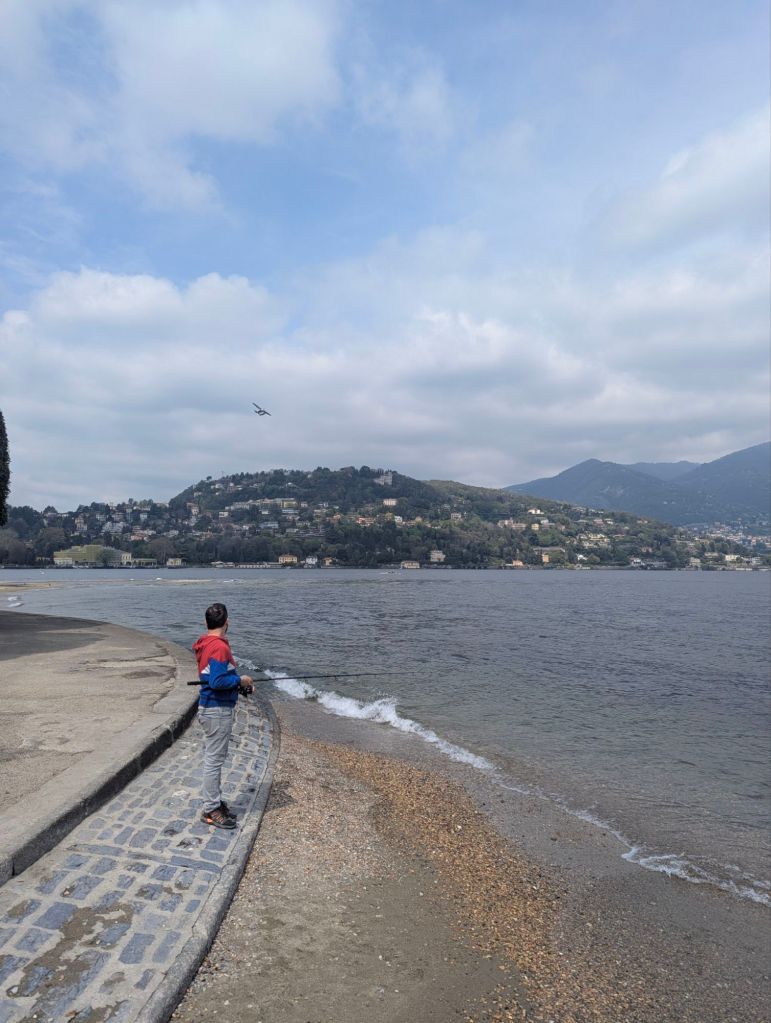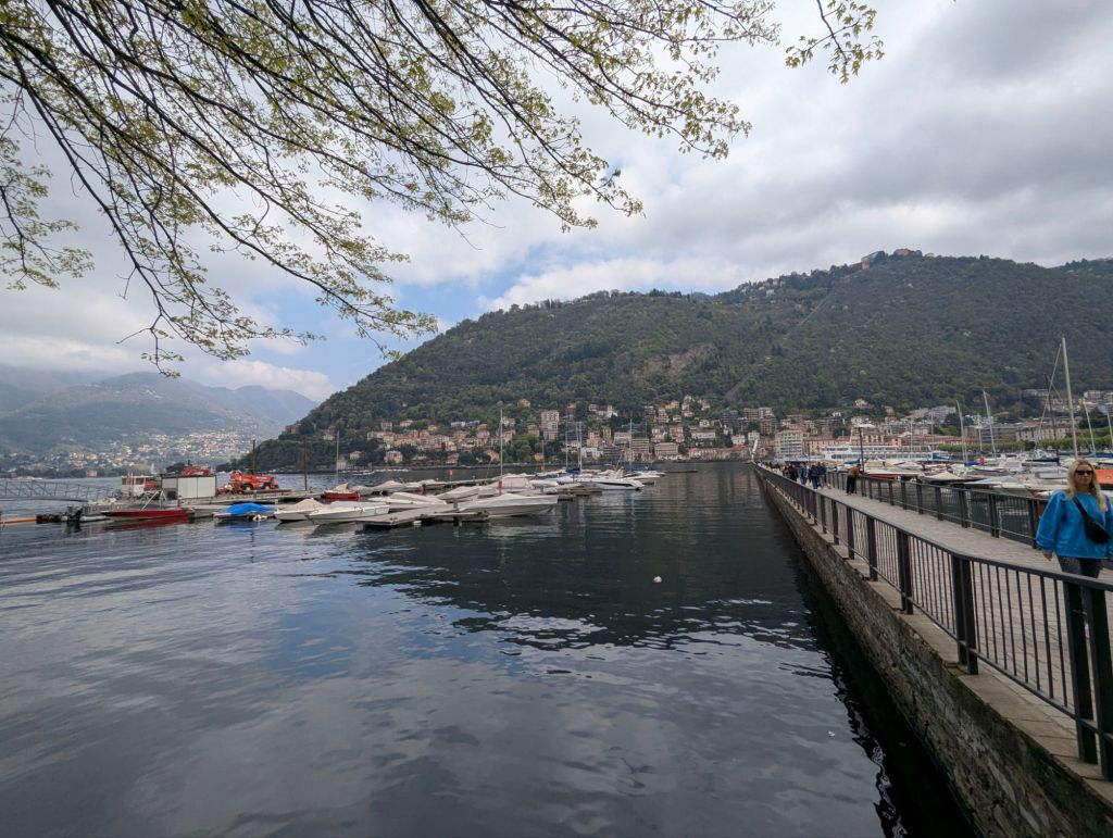 Now, Lake Como — the mythical playground of the rich and famous, promising sunshine, glamour, yachts… except today it was cold, grey, and about as glamorous as Skegness in November. K, in her shorts and t-shirt, immediately turned blue. Shops were still closed, so there was no chance of buying extra layers. Luckily, T had a spare jacket. Crisis half averted.